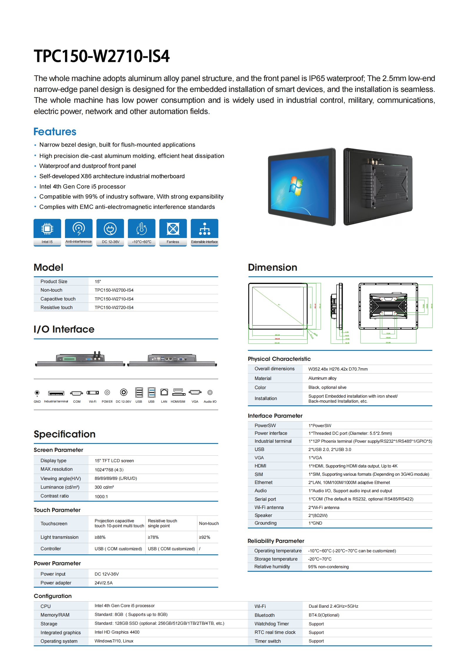 Large Industrial Touch Panel & IP65 Protection: The 15-inch 4:3 XGA industrial touch panel offers an expansive viewing area, ideal for displaying more vertical content and legacy HMI interfaces. As a true IP65 touch screen PC, its front panel is completely sealed against dust and water jets, ensuring reliability in tough conditions.