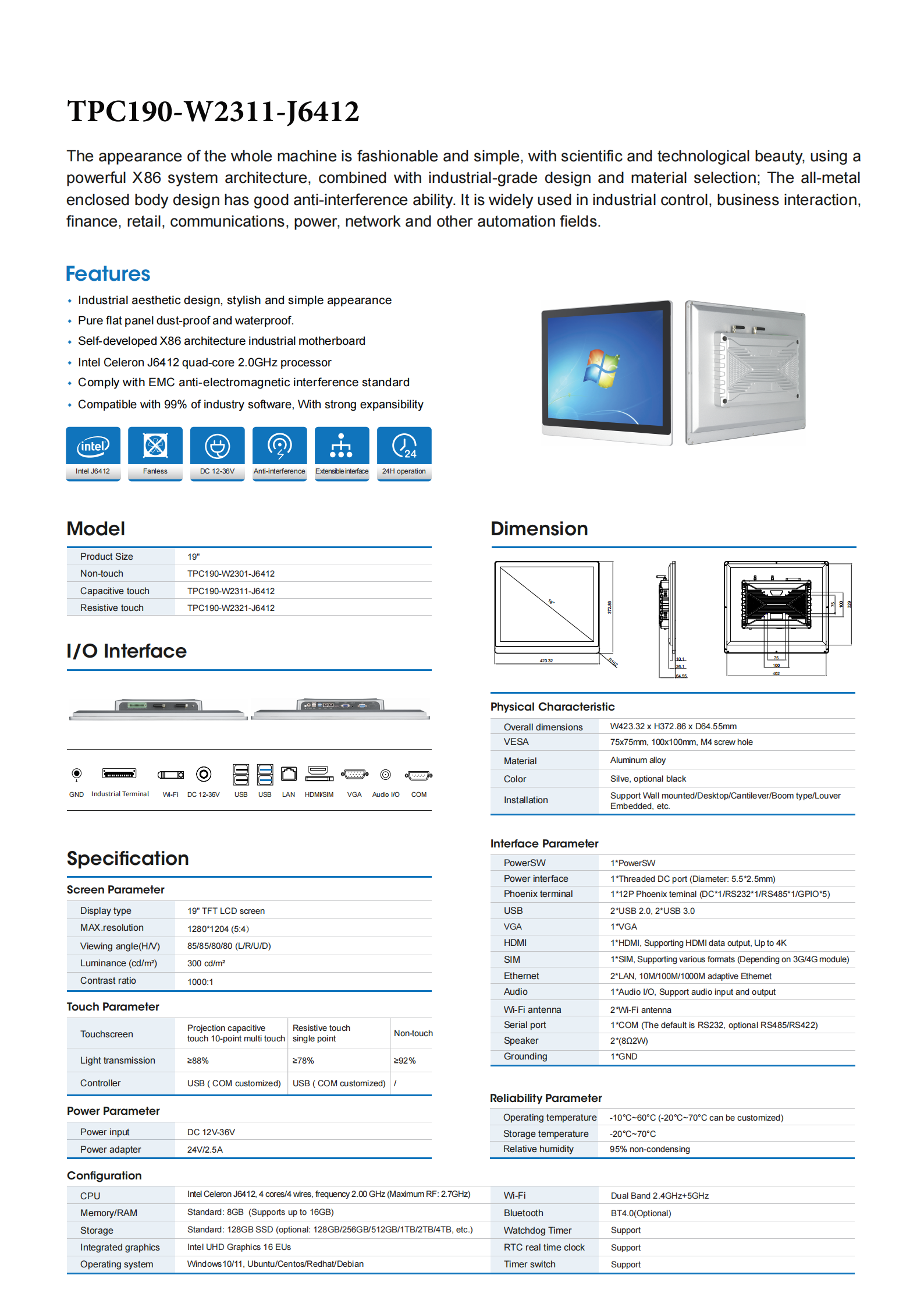 Powered by an Intel Celeron J6412 quad-core 2.0GHz processor and a self-developed x86 industrial motherboard, this best industrial panel pc ensures stable operation with 99% industry software compatibility and strong expansibility. The pure flat, dust-proof/waterproof design and EMC anti-interference certification make it ideal for smart manufacturing, automation, and harsh industrial applications.