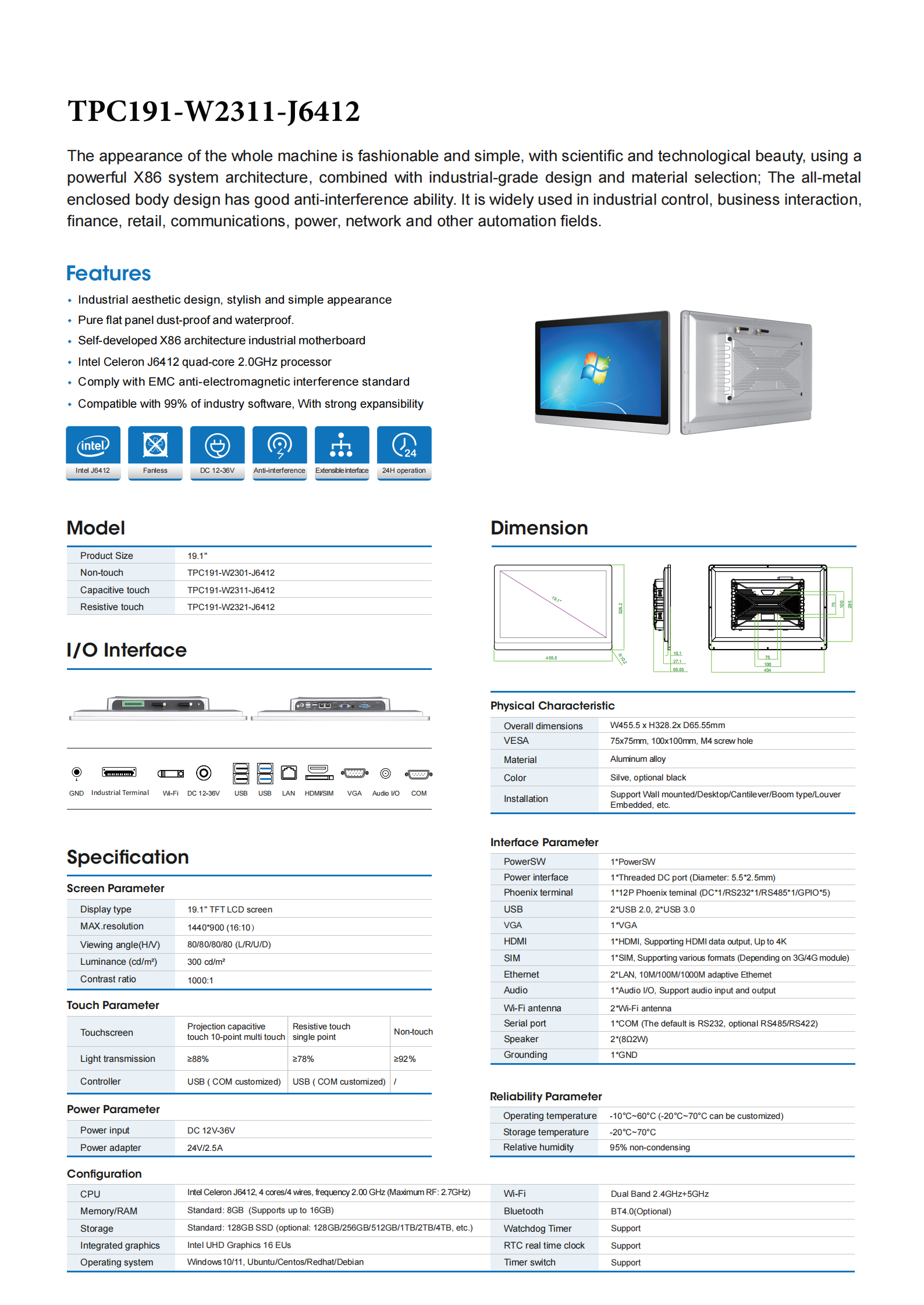 This industrial tablet PC features a 19.1" TFT LCD touch screen with 1440×900 resolution (16:10) and 300 cd/m² brightness, supporting both capacitive and resistive touch technologies. Powered by an Intel Celeron J6412 quad-core 2.0GHz processor and a self-developed X86 architecture industrial motherboard, it delivers robust performance and reliability. Designed with a pure flat panel for dust-proof and waterproof protection, it complies with EMC anti-electromagnetic interference standards. As one of the leading industrial panel PC manufacturers, we offer this highly expandable solution compatible with 99% of industry software, making it the best industrial panel PC for diverse harsh environments. Its industrial aesthetic design combines simplicity with durability, ensuring optimal functionality in demanding applications.