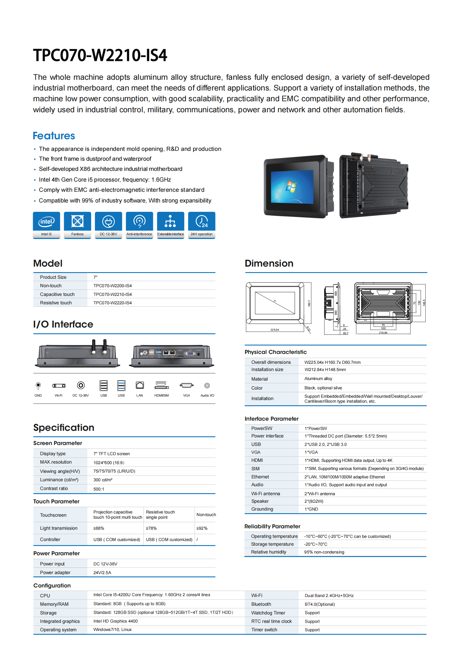 ●Flexible Touch Experience: Features a 7-inch TFT LCD with both capacitive and resistive industrial tablet PC touch screen options. The 1024×600 resolution and high 300 cd/m² brightness ensure excellent visibility even under bright lighting.