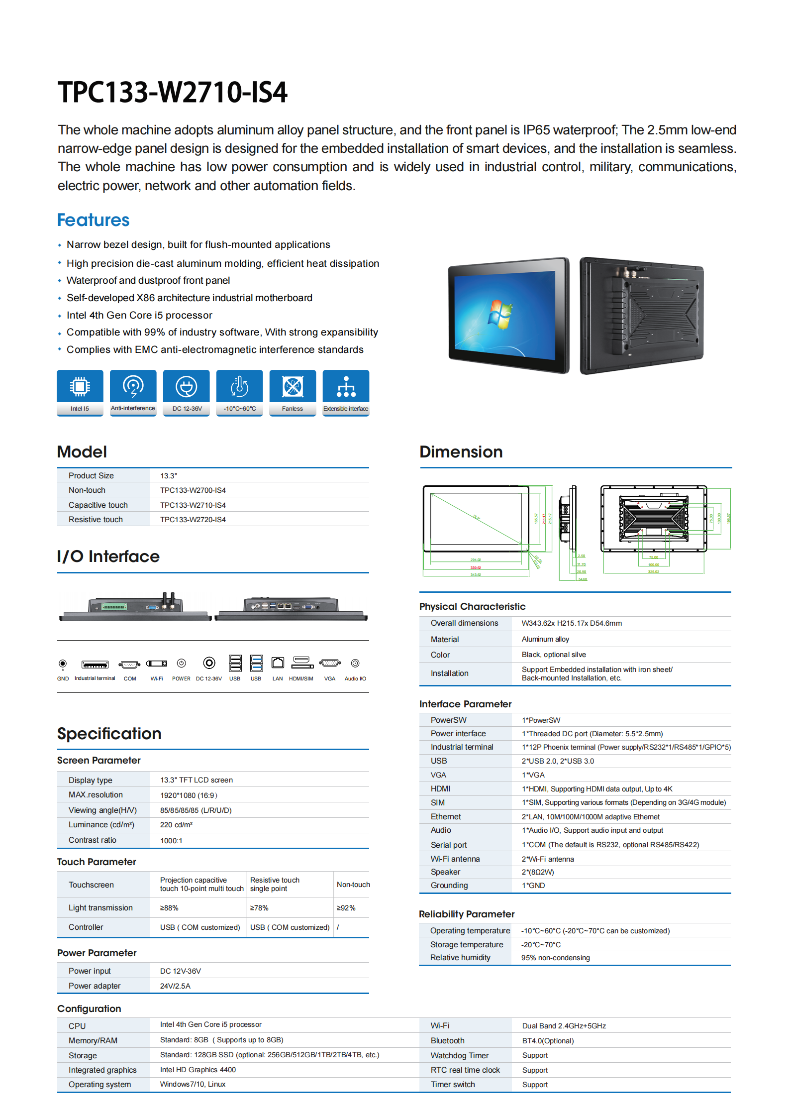As a professional rugged tablet pc manufacturer, we proudly present this 13.3-inch Full HD industrial touch panel. It combines a large high-definition display, IP65 front-panel protection, and robust industrial performance to meet the demands of the most challenging environments. It is the ideal IP65 touch screen PC solution for automated production lines, data acquisition, and visual control systems.