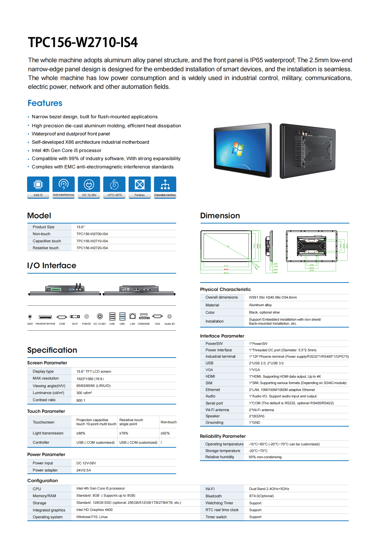 ●Excellent Display: 15.6" FHD touchscreen with capacitive/resistive options, 300 cd/m² brightness, and a narrow bezel for flush-mounted applications.