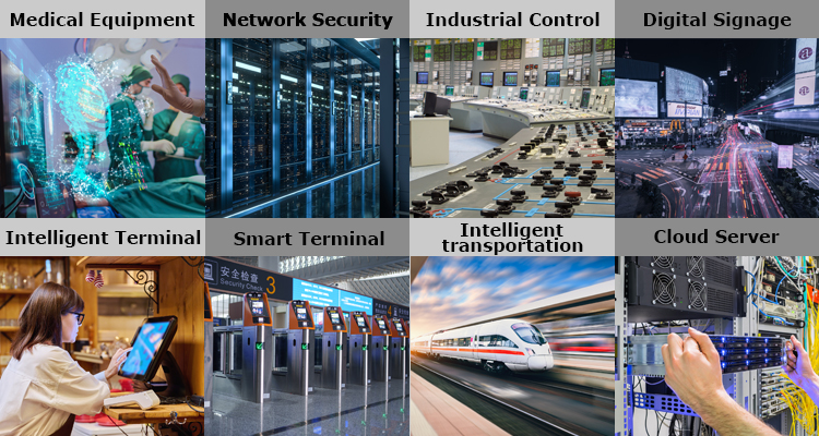 We have a comprehensive layout in the fields of smart loT and cloud computing.Our products have been widely used in industrial equipment automation (intelligent manufacturing), self-service terminal, network security, digital signage, medical equipment (medical imaging), intelligent terminal, intelligent transportation, cloud server, cloud storage, machine vision, robot, intelligent kiosk, GPS navigation, instrumentation, Government agencies, telecommunications, banking, electricity, vehicle automation (control and display), monitors, video doorbells, portable computers, intelligent teaching, environmental protection equipment, etc.