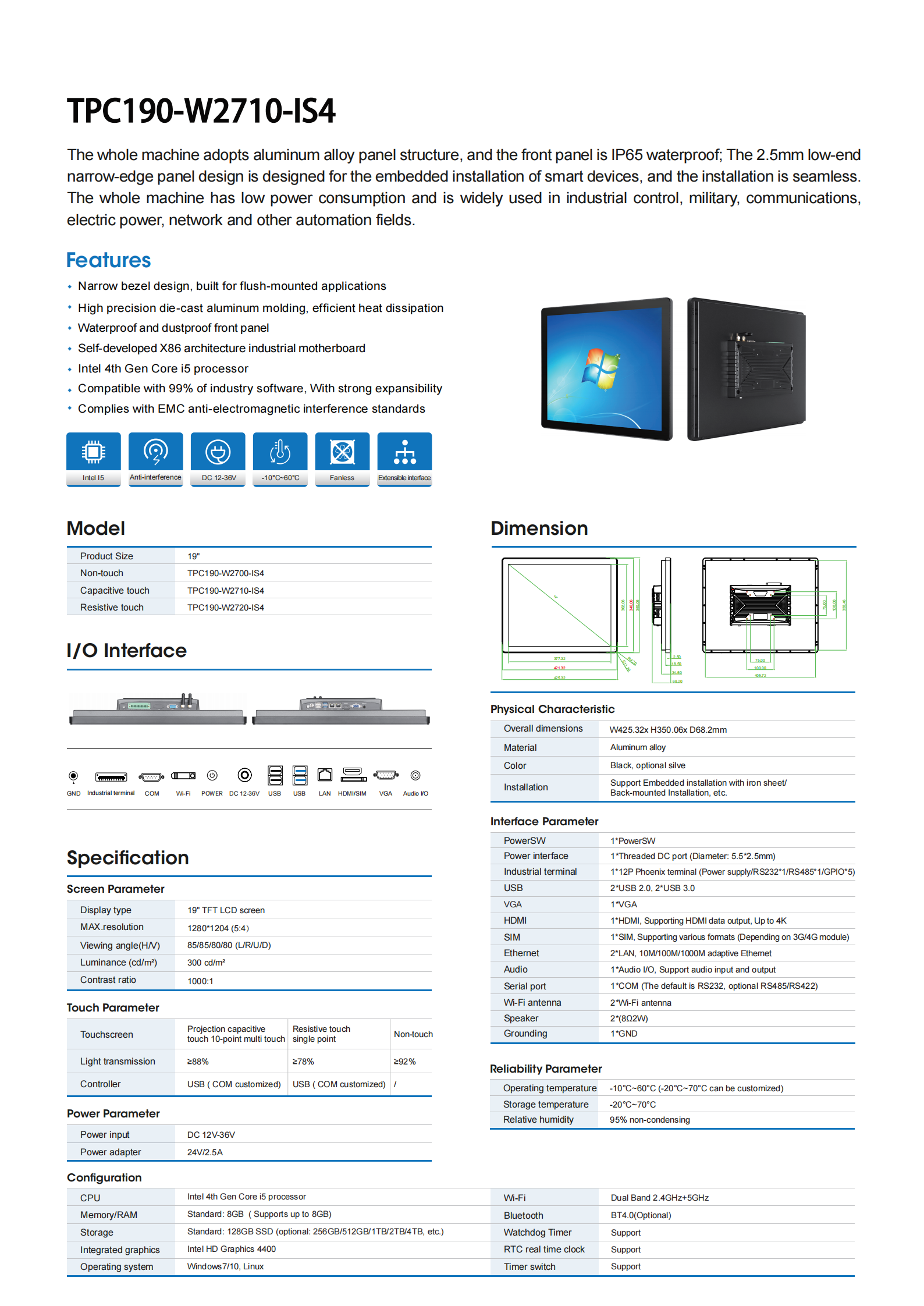 ●Professional Industrial Display: Features a 19-inch TFT LCD with a 1280*1204 (5:4) aspect ratio, 300 cd/m² brightness, and capacitive/resistive touch options, ideal for various vertical markets like production lines, medical, and control rooms.