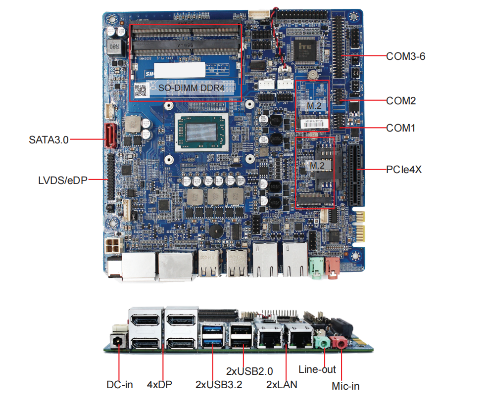 Designed as a highly flexible custom AMD Industrial Mainboard, it boasts a rich set of I/O options, including 4x DisplayPorts, 10x USB ports, 6x COM ports, dual Gigabit Ethernet, as well as legacy PS/2 and LPT interfaces, ensuring seamless connectivity with a wide range of industrial equipment. Its expansion capabilities are equally impressive, with 2x DDR4 SO-DIMM sockets, M.2 slots for 4G modules or SSDs, a SATA 3.0 interface, and both PCIe x1 and PCIe x4 slots, offering ample room for customization as a true AMD Industrial Mainboard. Furthermore, it supports GPIO, Realtek HD Audio, an optional TPM 2.0 security module, and is compatible with both Windows and Linux operating systems, making this AMD Embedded Motherboard a reliable and versatile core for any rugged environment.